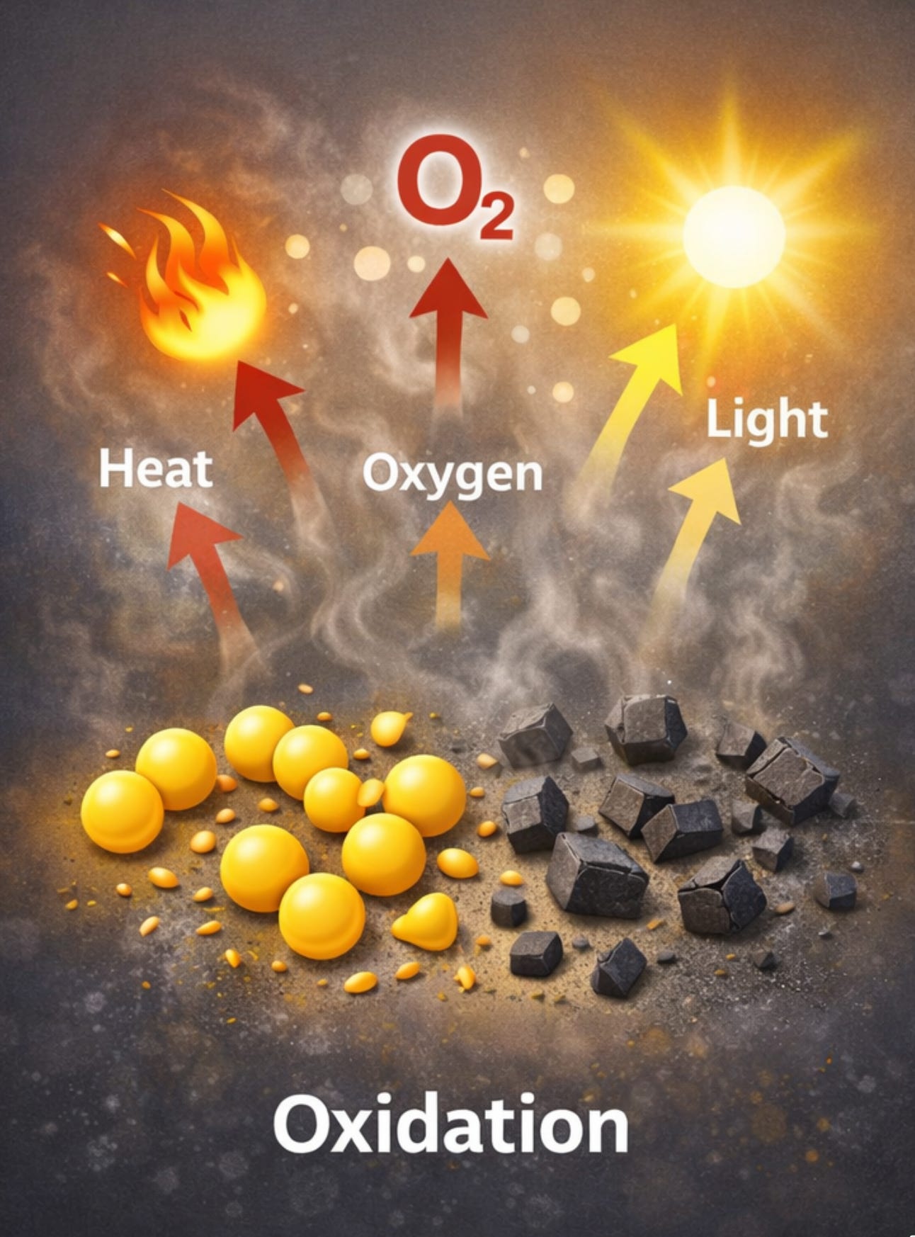 When these fats are exposed to heat, oxygen, and light, they slowly begin to break down. This process is called oxidation. (oxidation simply means oxygen reacting with fat molecules and changing them)